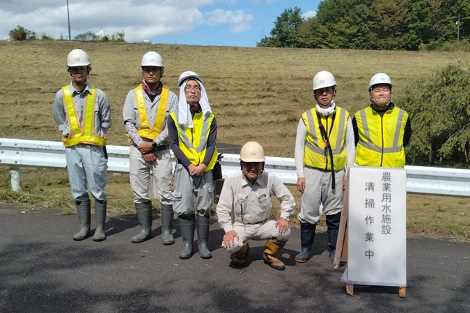 土地改良施設の管理保全の一環として、安積疏水土地改良区様の御指示のもと、調整池護岸部分及び管理等周辺のゴミ拾い、管理棟周り及び駐車場周辺、堤体管理道路の草刈り作業を行っています。